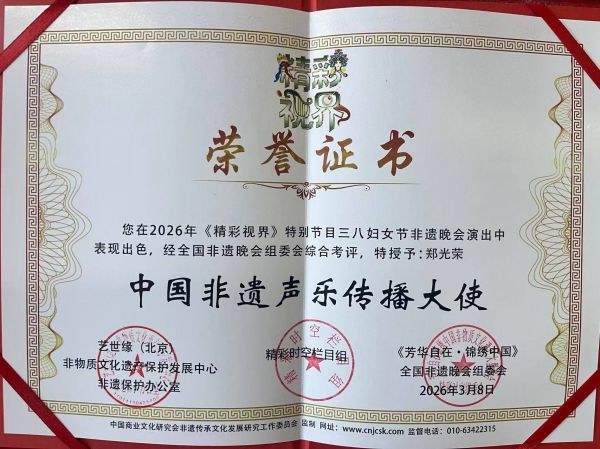 非遗吆喝传承人郑光荣凭借精湛的舞台表演与突出的文化传播贡献,被艺世缘(北京)非物质文化遗产保护发展中心、非遗保护办公室、精彩时空栏目组、《芳华自在·锦绣中国》全国非遗晚会组委会联合授予“中国非遗声乐传播大使”荣誉称号,以专业实力与坚守担当,为非遗吆喝传承再添重磅认可。