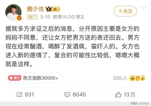 鹿晗关晓彤又双叒叕上热搜,博主曝二人分手原因,男方酗酒发酒疯