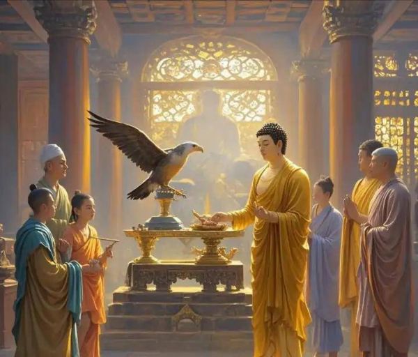 奇怪的是,佛祖身上的肉快要割尽了,秤盘上显示的重量还不能等于一只鸽子。最后佛陀只得把全身的肉都割到称盘上赔给老鹰。这时老鹰对菩萨道:“现在你后悔了吧?”佛陀回答说:“我无一念悔恨之意。如果此话是真的,那么,当让我身上的肌肉,重新生长复原吧。”誓愿刚说完,只见他身上肌肉立刻恢复了原状。老鹰也被佛陀感动了,展翅飞向远方。