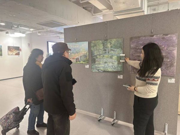 二楼“艺汇凌云”展厅里,《睡莲》的朦胧紫绿晕染出水面的波光,《春天的花》以浓艳的笔触勾勒出春日盛放的生机,《船上画室中的莫奈》则定格了塞纳河畔的创作瞬间。社区居民们凑近端详,艺术的温度在烟火气里慢慢流淌。