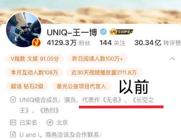 他将使用多年的UNIQ-王一博正式改为王一博・YIBO,彻底去掉UNIQ前缀,认证中也删除了UNIQ组合成员标签只保留演员、歌手身份,并新增代表作《探索新境》。