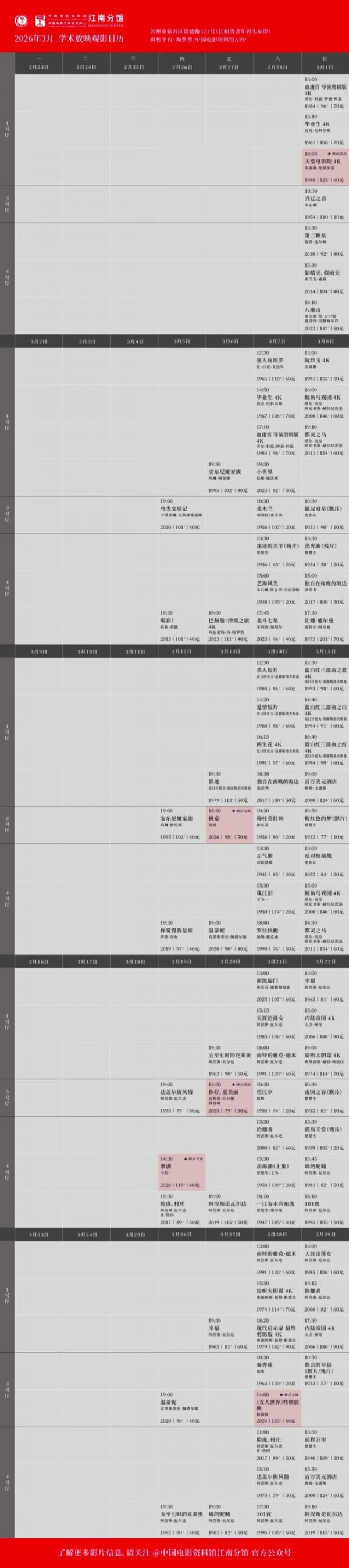 所有场次均可在淘票票、中国电影资料馆APP购票,具体排片见次图,祝大家观影愉快。❤️