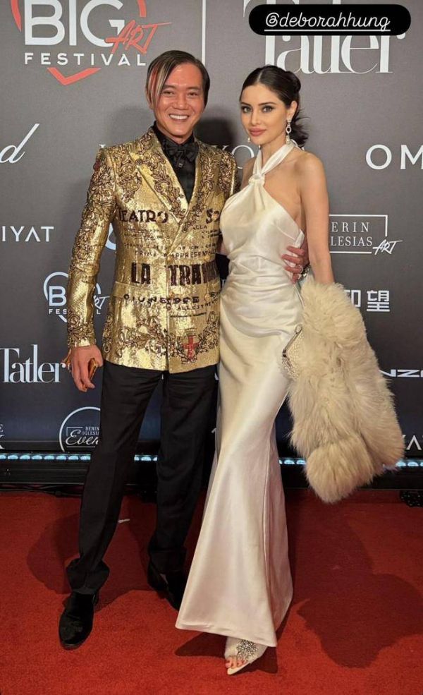白天参观完艺术展,晚上他们又出席了艺术展的晚宴。与白天的轻松造型不同,晚宴上的洪永时和妻子换上了更加隆重的服装。洪永时穿上了一件金色印花西装外套,外套上的花纹错综复杂,甚至带有一些黑色的字体,极为浮夸;而他下身搭配了一条黑色西裤,内里是黑色衬衫和领结,整个人看起来非常高调,毫不掩饰他的富贵气息。妻子则换上了白色的晚礼裙,并披上了一件皮草披肩,整个人显得贵气十足。