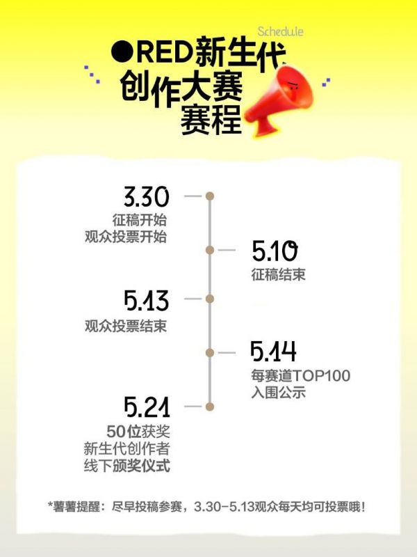 最终评选出的50位“RED新生代创作者”将获得每人10万元创作基金、12个月不间断专属流量助推、个人主页荣誉Title及红V认证等奖励。此外,所有入围的1500个作品将获得平台实体荣誉认证,所有参赛创作者将共同瓜分百亿赛事专属流量。