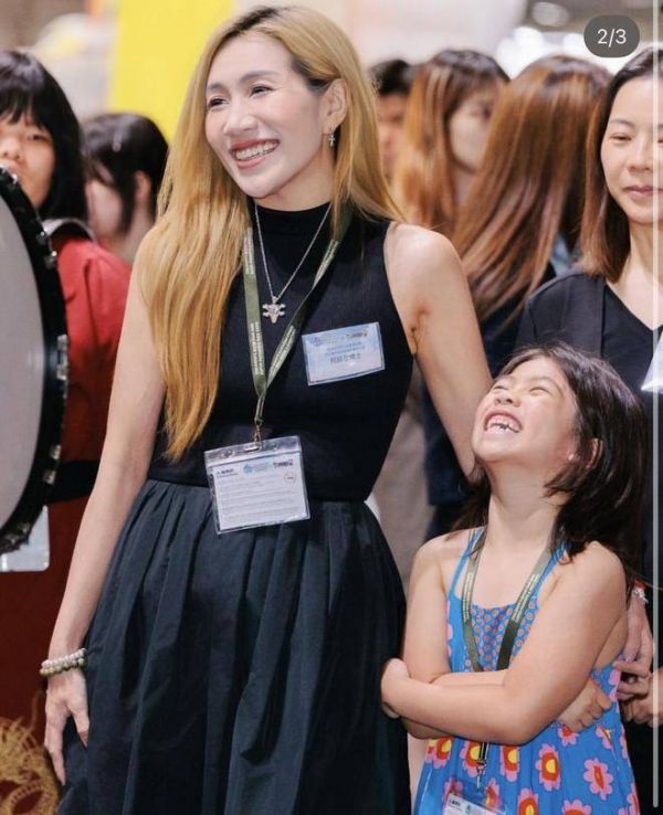 作为母亲的何超盈,自然全程陪伴在女儿身旁。当天她身穿一袭黑色连身裙,金发自然垂落在胸前,整个人显得优雅而干练。近年来的她身材恢复得非常好,瘦削的身形与纤细的手臂尽显气质。胸前除了挂着工作证,还贴着一块写有何超盈博士的铭牌,低调中又带着学术气息。辛阡觅当天穿着蓝色碎花吊带裙,站在母亲身边,脸上洋溢着骄傲与开心的笑容,她还在自己主打的画作前摆姿势留影。而何超盈的心情更是溢于言表,满脸骄傲与喜悦,显然为女儿的成长感到无比自豪。