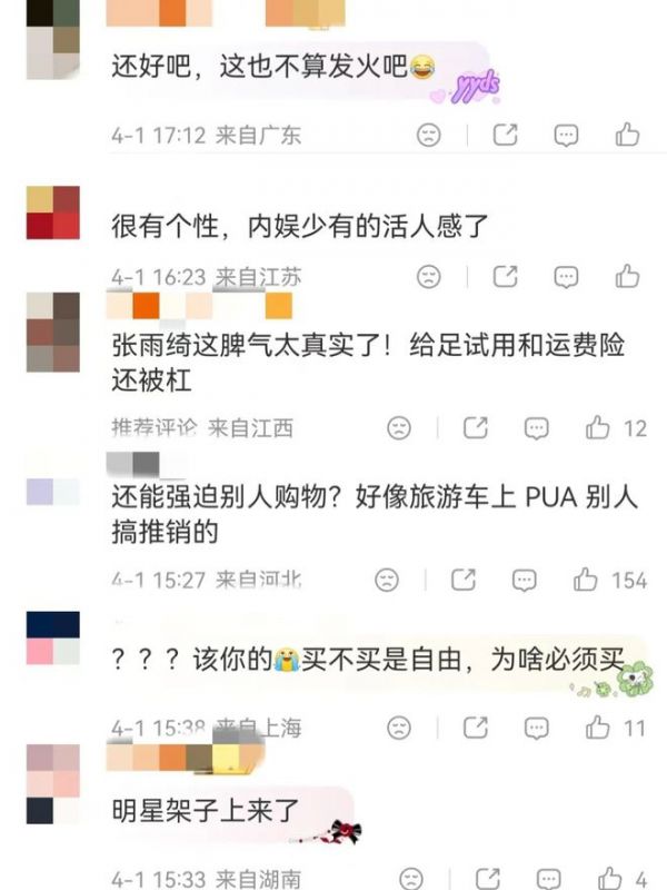 随后,张雨绮当场回应:“你先用一下,不行你就退,不喜欢退,没关系,你搁那不付款就给你送?”“给什么给”“给他都不付款,气死我了”,"好说不听,歹说不听!试用完退也行,不付款白送运费险?还想要什么?什么给?还给个P啊!"。