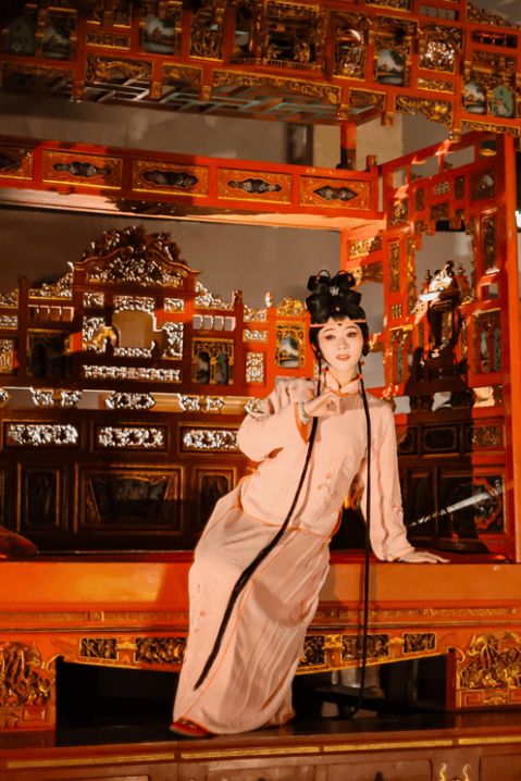 最终的舞台呈现令人惊喜。舞台上,“大闷”中的五娘在闽南特有的红眠床前辗转反侧,回忆往昔,和另一个时空里的自己对话。另一侧,当年的五娘、陈三和丫鬟益春在勾栏里上演着流传千年的爱情故事,剧中经典的表演段落被一一展现,传统的表演细节亦被放大。观众既感受到梨园戏经典唱念做演的精华,又看到多重时空多个视角的切换,古典审美和当代剧场体验在其间并存。