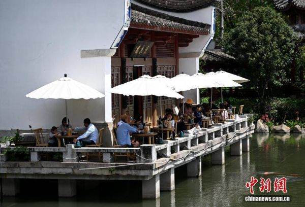 4月4日,市民在福州黎明湖公园的喝茶休闲。清明假期首日,福州天气晴好,市民纷纷走出家门,在湖光春色中享受假期时光。中新社记者 吕明 摄
