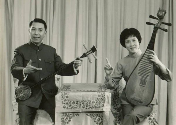 与恩师凌文君(左)拼档长篇弹词《金陵杀马》