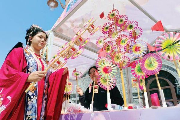 在河北省的国家级非物质文化遗产代表性项目秸秆扎刻技艺展位上,该项目省级代表性传承人徐健带来的高粱秆风车,正借着风力“哒哒”地敲击着胶泥小鼓,引人驻足。徐健为游人讲解:“制作风车用的高粱秆,是我们扎制古建模型剩余的,做成风车推出后颇受欢迎。”20元一个的小风车,一会儿就卖出二三十个。北京游客杨星辉感慨道:“我们一家从北京赶过来,在天津五大道的海棠花下,玩着河北省的秸秆风车,听着身边的欢声笑语,感觉真是京津冀一家亲。”