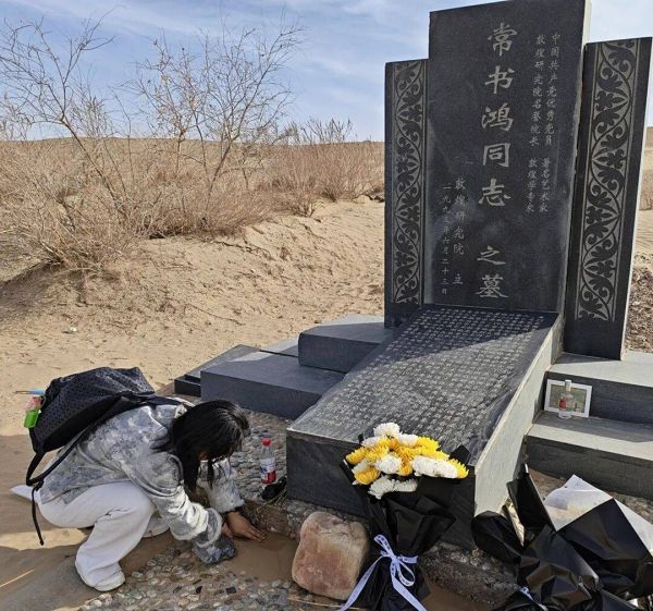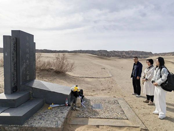 4月1日,浙江省博物馆专职党委副书记杨玲等一行,专程从杭州来到敦煌宕泉河畔的莫高窟公墓区祭拜常书鸿先生。先生的墓碑整洁肃穆,前方鹅卵石铺设的地面上镶嵌着一块黑色花岗岩铭碑,上面镌刻着“敦煌守护神常书鸿”。墓碑正对着莫高窟的标志性建筑——九层楼。