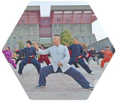 安徽省亳州市蒙城县博物馆广场上,市民在打太极拳。