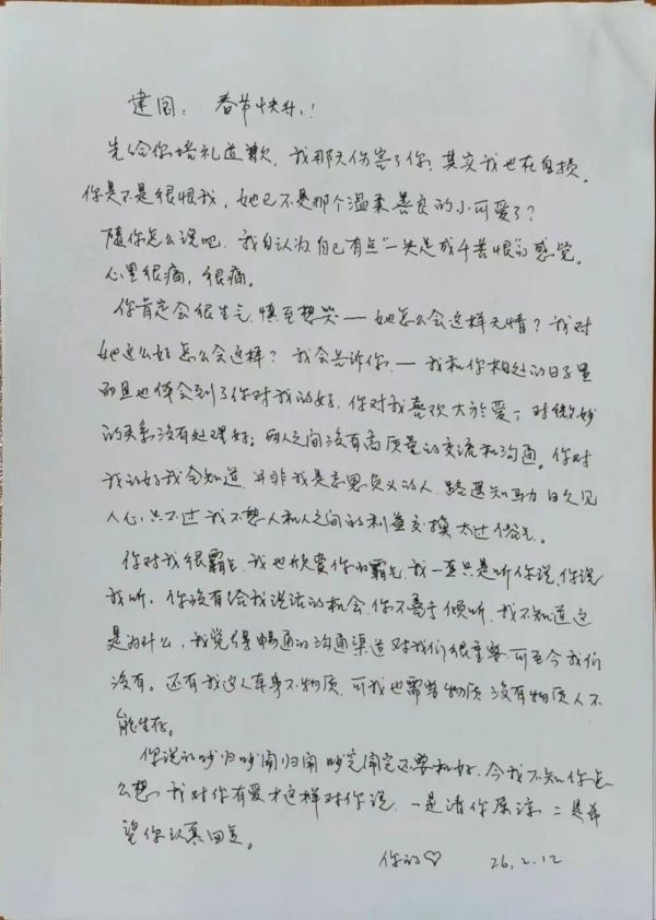 恋爱中也会有不愉快,2026年2月,王彩华跟建国闹了矛盾。思来想去,她决定写一封信以表心意,希望重归于好。她把一张A4纸写得密密麻麻,“我对你有爱才这样对你说,一是请你原谅,二是希望你认真回复”。信的署名是:你的♥。