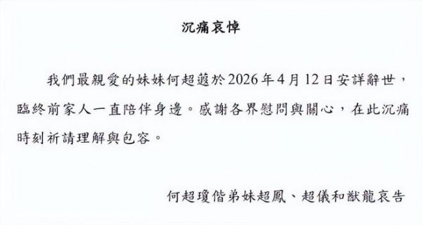 姐姐何超琼作为家属发布哀悼声明,消息震惊各界。无数网友表示错愕!