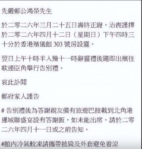子女郑子斌、郑嘉宝也分别与另一半送上花牌,写着“父亲大人冥鉴 永远怀念”和“岳父大人冥鉴 永远怀念”,可以说十分的低调。