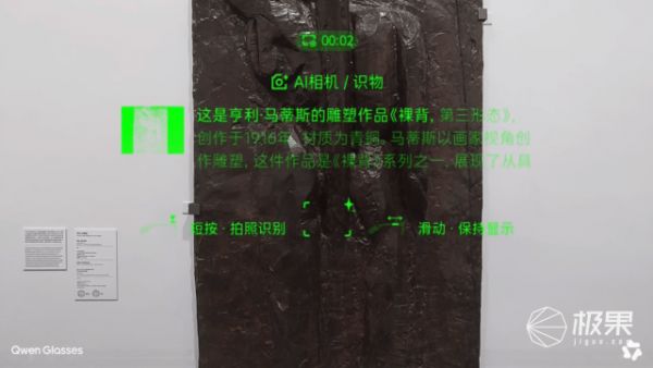 观众也可以随时就眼前的展品细节发起追问。例如,在马蒂斯的青铜浮雕《裸背,第三形态》前,有观众提问“他为什么把人体简化到这个程度”,眼镜随即调取该系列作品的演变脉络,展示了马蒂斯如何用数年时间反复雕琢同一个背影,逐步剥离细节、提炼形体本质。观众对照眼前这件介于具象与抽象之间的“第三形态”,对这一创作脉络有了更直观的理解。