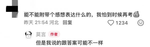 更有网友预言,这本新书的内容可能会成为考题,希望莫言先说明一下文字表达了作者怎样的思想感情,莫言也幽默回应:我说的可能和答案不一样。