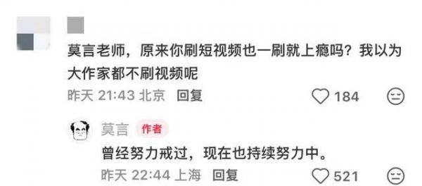 此前,莫言就在一场座谈会上提及自己刷视频的习惯。他表示,经常一刷一两个小时,有时候,他会提醒自己一天只能刷半小时视频,结果等放下手机一看,三小时过去了。