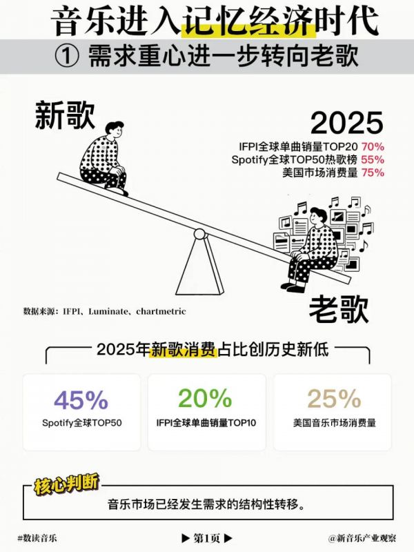 听众并没有消失,只是流向了老歌。美国市场尤为典型,2025年,发行超过18个月的歌曲消费占比达到75%,而在传统唱片时代,这一数字通常不超过35%。