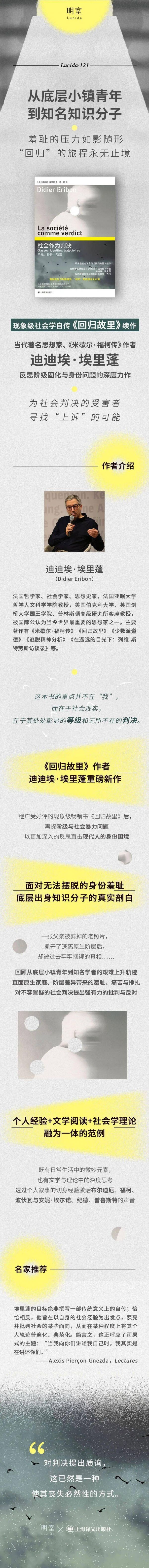 当代著名思想家迪迪埃·埃里蓬(Didier Eribon)在《社会作为判决》中以一种更大的坦诚与更深入的内省,探讨了在《回归故里》中未能充分展开的个人叙事与社会思考,深刻剖析了这种羞耻感的来源:它是被社会与文化机制悄然内化的“判决”。通过教育和日常交往,特定的品味、谈吐被塑造为“高雅”标准,让来自不同背景的人不断自我修正与怀疑。这种分裂并非个人失败,而是社会等级在身体与记忆中的深刻烙印。