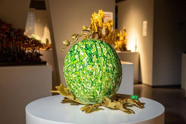 为纪念二十周年推出的“水果Party”系列作品,以苹果、香蕉等日常水果为符号,用熔铜的“无模之形”结合庚彩的“流动之色”,象征二十年匠心耕耘后的累累硕果。此外,纪念作品《天葵》以天球瓶形态承载20朵形态各异的葵花,呼应二十载光阴。谈及这件作品,朱炳仁说:“20年前,熔铜艺术与孙儿一同来到我身边,这是上天的礼物。”