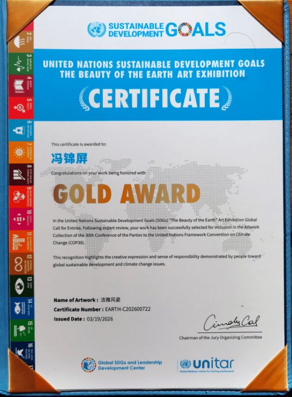 冯锦屏创作的国画作品《洁雅风姿》,被认定为兼具艺术高度、文化厚度与社会价值的杰出作品。以独特的视角与文化表达,展现东方智慧对地球未来的思考与担当,高度契合本次展览的精神内核。在第30届联合国气候变化框架公约缔约方大会,联合国可持续发展目标《地球之美》艺术展中荣获金奖。