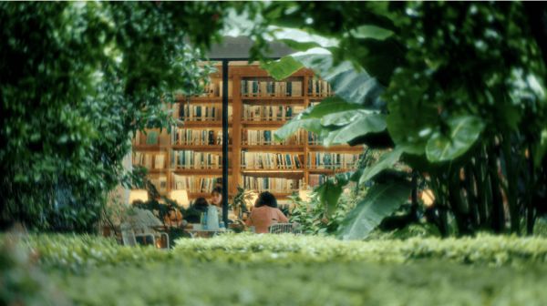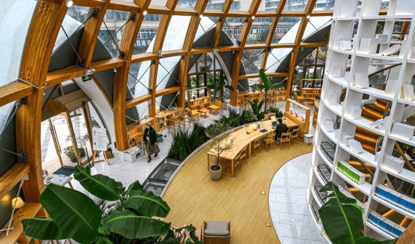 从艾溪湖三路慢慢循着绿意转个弯,走进公园左侧,一座上下两层的玻璃房映入眼帘,这便是“美书馆”。它像是从泥土里长出来,原木色的结构框架与落地的玻璃门窗在绿意中毫不突兀。推门而入,暖黄的灯光与窗外透进的春日光线交织在一起。