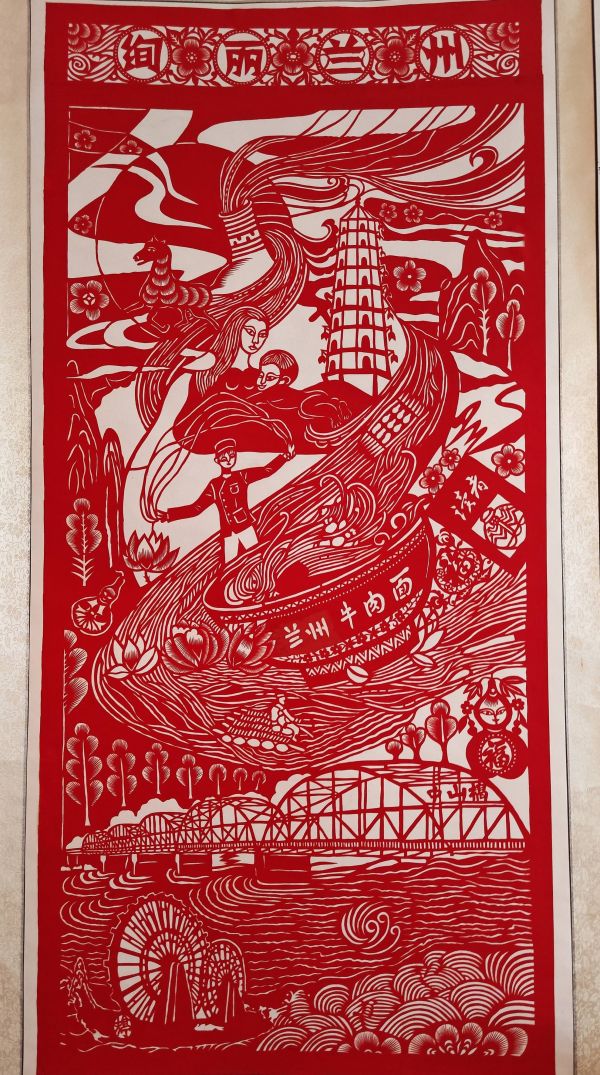 整幅剪纸以刀为笔、以纸为卷,将自然景观、人文地标、民俗工艺与地方文化符号自然交织,既有黄河文化的雄浑厚重,又有金城生活的温润烟火,于方寸之间展现兰州独特魅力,是传统剪纸艺术与地域文化相融的生动体现。