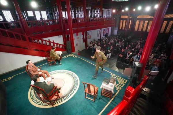 “颜料会馆的场地非常独特。”《宋美龄耳环丢了》监制侯栋印象深刻,初见这座老会馆,朱红色的二层戏台便让他眼前一亮。此前,《宋美龄耳环丢了》曾在其他城市上演,已有相对完整的故事框架,但为了不“辜负”这座戏台,主创团队着意新添了不少戏曲元素,进而把整部作品打磨得更符合背景时代的特点。另外,会馆戏台后方还有一间堪称狭小的化妆间,平时少有观众留意,主创团队因地制宜,设计了一个“严刑逼供”的场景,让空间特点与剧情节奏紧密咬合。强烈的代入感、参与感,是“沉浸式”观演体验格外引人入胜的魅力所在,截至目前,《宋美龄耳环丢了》已在颜料会馆驻演约50场,上座率可达95%,其中青年观众占比超过七成。