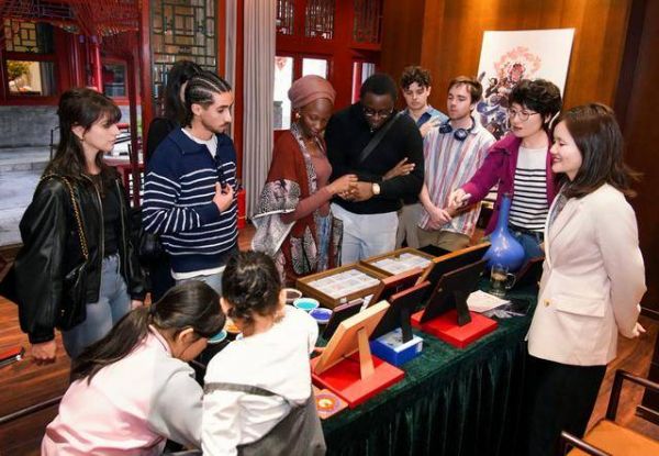 4月19日,观众在正乙祠戏楼体验景泰蓝工艺制作。北京日报客户端记者 方非摄