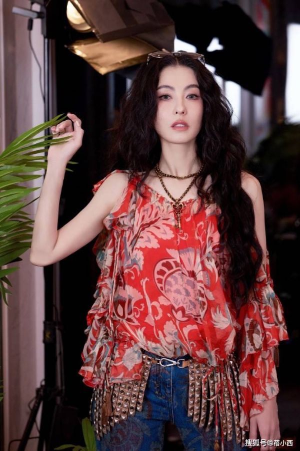 这一身穿搭给人柔中带刚的感觉,印花上衣的柔美和带有流苏的腰带、提花牛仔搭在一起,又有女人味又不软塌,细节相当到位。