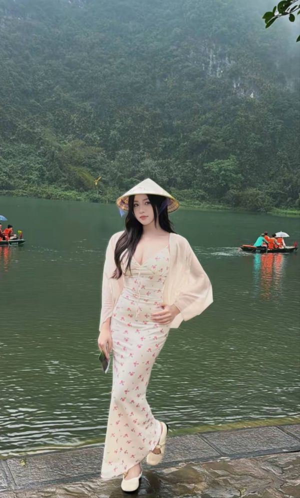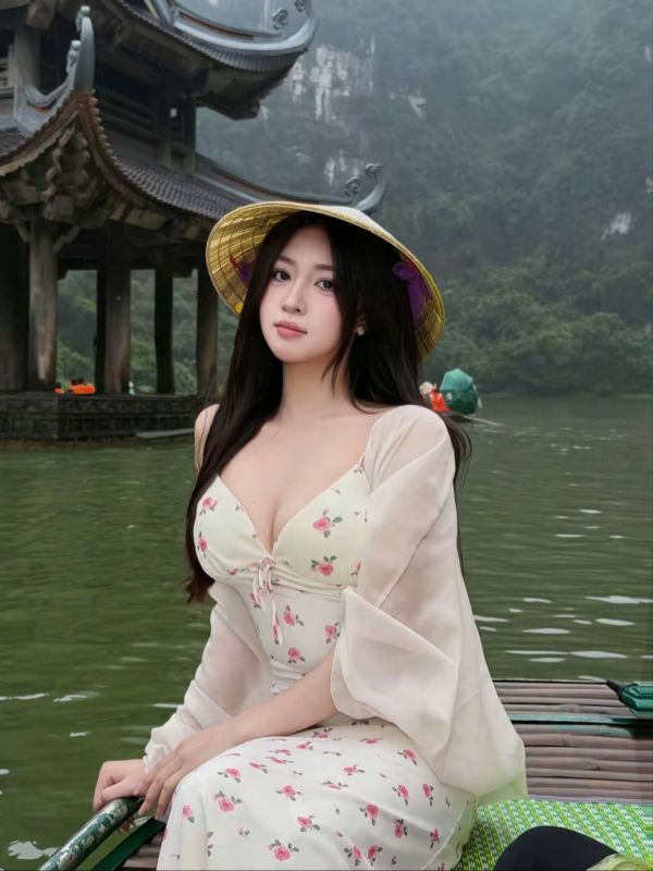 在山水画卷中,她是静谧的诗行。身着碎花长裙,外披轻纱,侧坐竹筏,或凭栏远望。远山如黛,雾气氤氲,水面倒映着古建筑的飞檐,她的身影仿佛是这幅水墨画中唯一灵动的色彩,宁静而悠远。