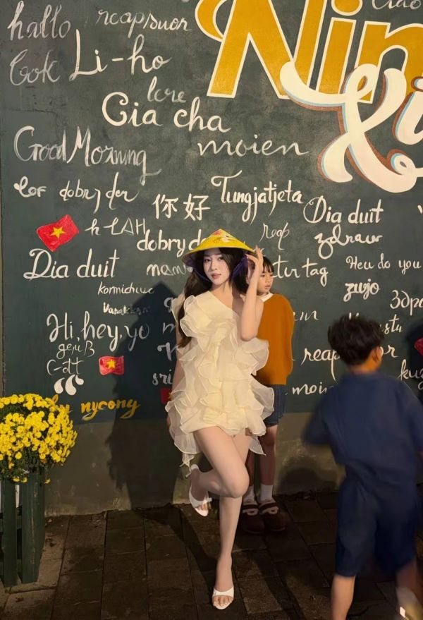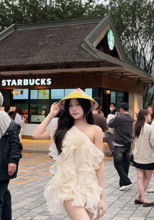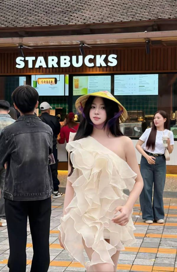 而当她戴上那顶醒目的黄斗笠,走向现代街头,奇妙的碰撞便开始了。在写满各国问候语的黑板墙前,她优雅驻足;在星巴克标志性的绿色招牌下,她手扶帽檐,从容穿行。古典的斗笠、飘逸的长裙,与现代的咖啡文化、街头行人同框,竟意外和谐,展现出一种不设限的多元美感。