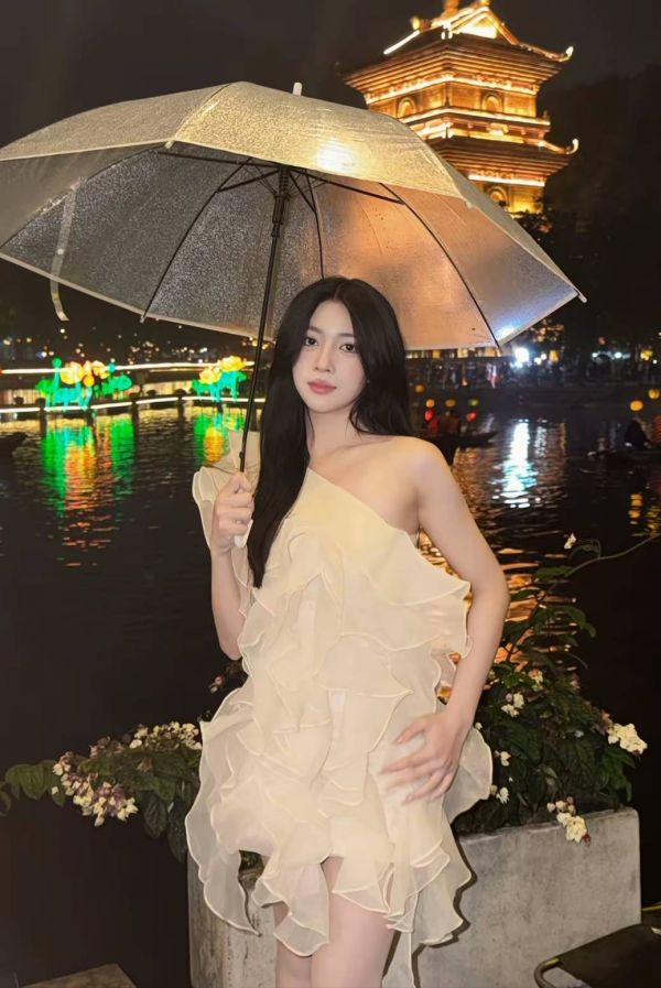 当夜幕降临,她撑起透明雨伞,立于五彩灯光倒映的水边。古塔的暖光勾勒出她的轮廓,将传统韵味悄然融入梦幻的夜色。