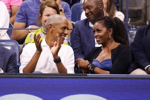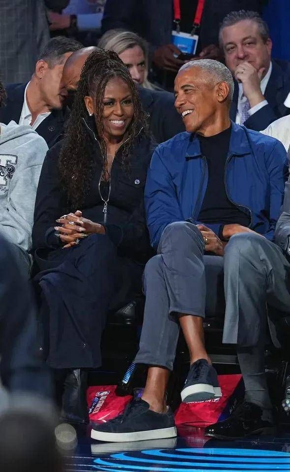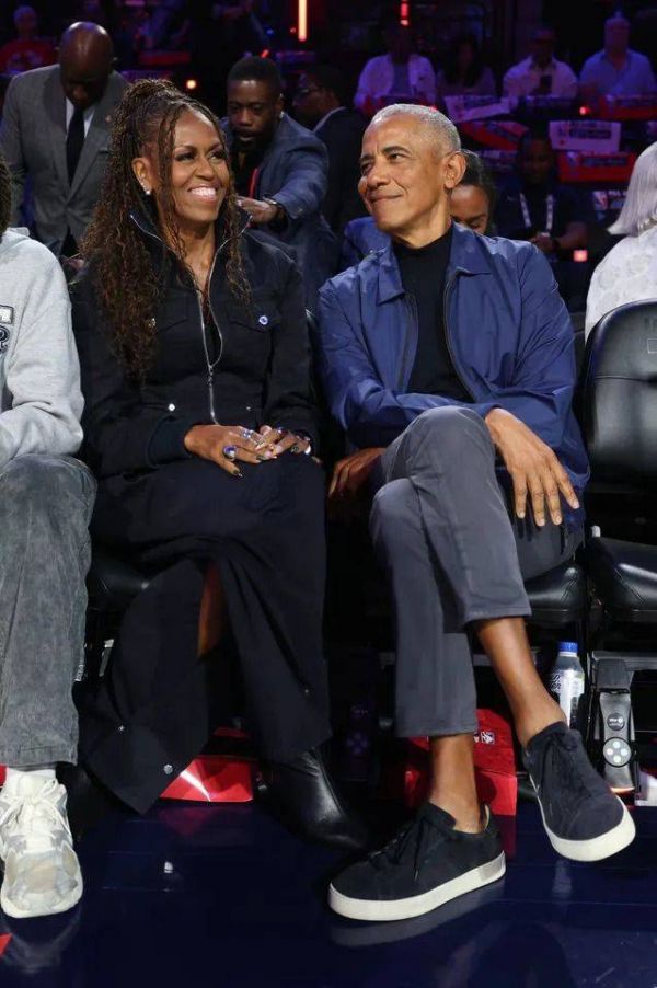 从公开的照片看,夫妇二人的穿搭默契十足,均以全黑色系亮相。米歇尔选择了一件高领毛衣,外搭皮质西装外套,下身配以花纹长裤,并点缀了金色首饰。她的长发编成细辫,束成低马尾,几缕碎发修饰脸型,妆容精致,显得神采奕奕。一旁的奥巴马则是一贯的优雅风格,穿着西装与系扣衬衫,风度翩翩。