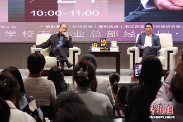 4月24日,莫言与浙江大学学生交流现场。当日,杭州市全民阅读活动周系列活动——诺贝尔文学奖得主莫言与浙江大学人文高等研究院学术委员会主任罗卫东在浙江大学校友企业总部经济园围绕“阅读与城市”“阅读与成长”等话题与学生、读者进行交流分享。中新社记者 林波 摄