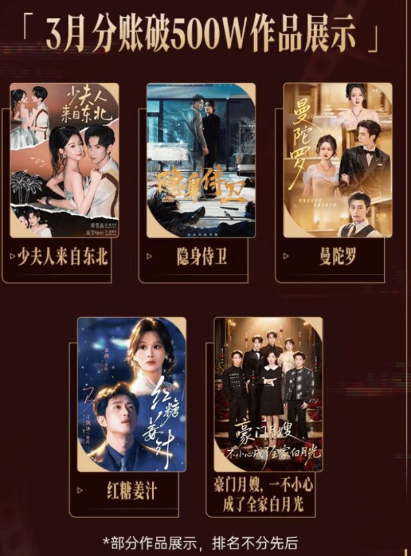而3月分账中,唯一明确破千万元的是听花岛的《少夫人来自东北》。这部剧在2月28日上线,正好符合“上线30天分账破1000万”的统计口径。也就是说,春节档上线30天分账破千万的真人短剧有20余部,到了3月,只剩下1部。