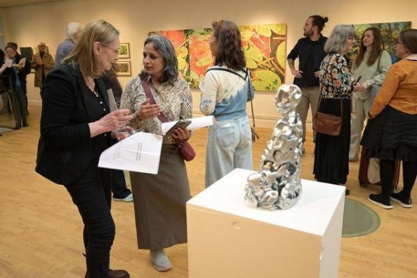 4月24日,在斯德哥尔摩中国文化中心举行的中瑞绘画雕塑展开幕式上,观众在雕塑作品前交流探讨。新华社记者 朱昊晨 摄