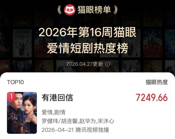 因此,剧情老套,但胜在服化道精致、男帅女美的《有港回信》,开播后热度一路走高。上线首周即空降云合中剧·周榜榜首,并6次摘得猫眼短剧有效播放日榜冠军。而在腾讯视频站内的热播榜上,位列前五的作品中,《有港回信》是唯一一部短剧作品。
