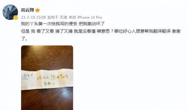 离婚之后,董璇并没有反对女儿与高云翔见面,尽可能的让女儿享受到来自父母的完整的爱。过年期间,高云翔还晒出了女儿给他写的小纸条,字迹虽然稚嫩,但满满的全都是来自女儿的爱,难怪为人父的高云翔会高兴坏了!