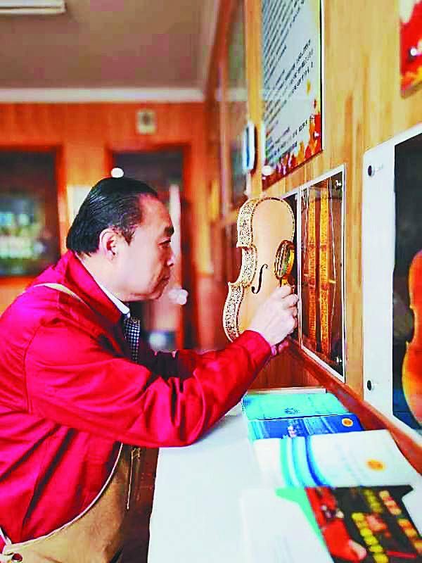 对这个发现,单东岩放在了心上,并先后三次去西班牙皇宫博物馆参观学习。“2005年和2006年3月,我在法兰克福乐器展会上收集到了更专业更全面的世界名琴画报和书籍,还去西班牙参观皇宫博物馆看四重奏提琴实体的相关信息。因提琴侧板的形状是弯曲表面图,每次参观时,我要补充不足的图像,待回国后再慢慢进行描绘,将多处凹凸的外形侧板图展示在平面板上。”在单东岩不断地调查、摸索和努力下,终于为世界古典名琴的恢复工作提供了充足详实的材料。“经多方面检测验证,确认每副图片上的花卉、动物、人物的各种姿态与展板图一样标准,再按照相关比例制作出每一块图像的样板。为制作每一支提琴的工艺打好基础。”经过多年的努力,他复刻的雕花四重奏提琴,一号提琴和二号提琴和中提琴已经基本完成,大提琴也预计在今年完成,“如果成功,将会是世界上第二套比较完美的雕花四重奏”。