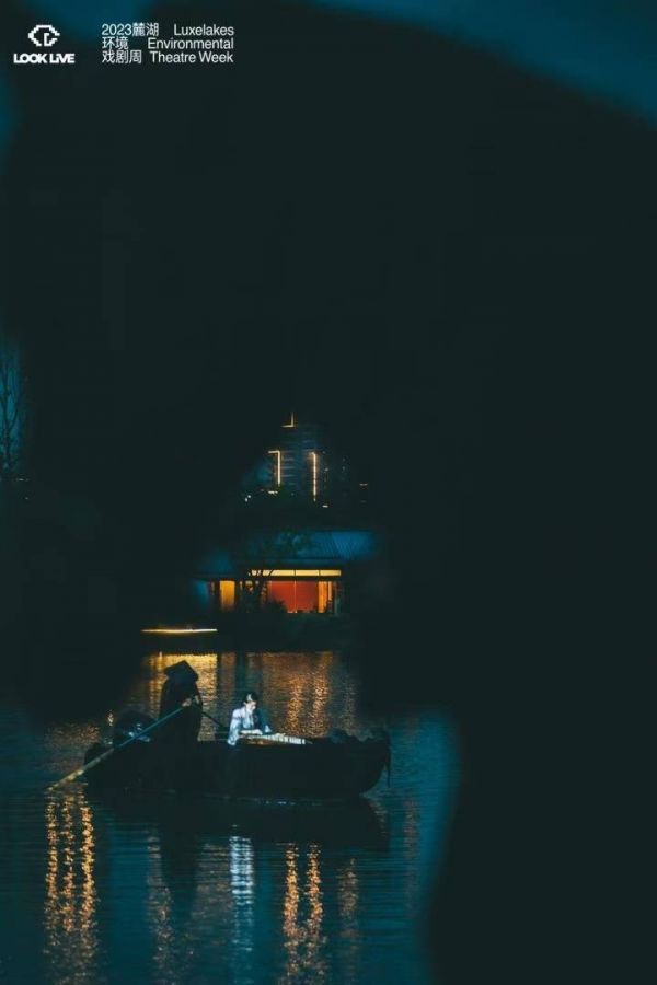 观众随着夕阳落山进入黑暗,一场融合感官、环境、交互体验的沉浸式“展中展”,在铮铮琴弦与层层推演下,将幻境的大梦打开。湖面上遥遥撑船的摆渡人与草坪上守候已久的黑马拉开整个戏剧的帷幕,撑船的“摆渡人”是全剧的开端,船头撑着油灯与大大的黑玫瑰,载着古筝“心弦”从远方彼岸幽幽送来,送入亦真亦幻的梦境。而牵马人戴着面具,与庭院入口的“戏剧之神”面具装置呼应,代表心灵的守护者,也是整个戏剧“梦境”的守护神。
