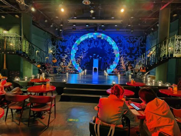 整个观众席是如同酒吧式的座位,充满了西洋异国风情。让人轻松温馨。而且近距离的融入,使得演员真正就像在观众面前,的演员和观众,真正做到了零距离。这样演员在剧中跟观众的互动便变得异常“亲切”