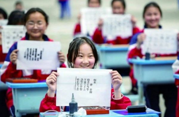 四川阆中的小学生体验传统印刷技艺在宣纸上印出来古诗。光明图片/视觉中国